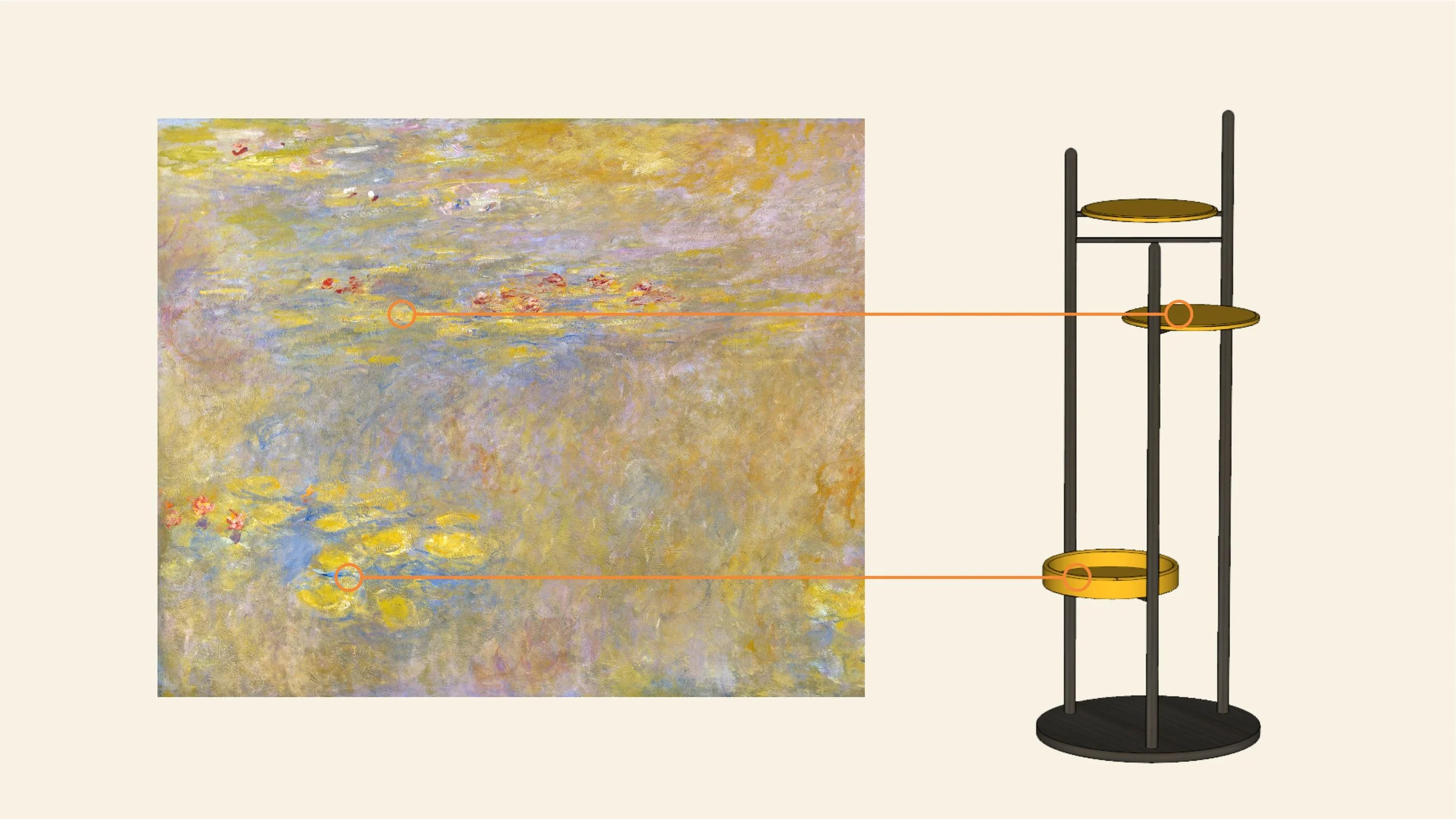 莫奈曾长期探索光色与空气的表现效果,常常在不同的时间和光线下,对同一对象作多幅的描绘,从自然的光色变幻中抒发瞬间的感觉。午后阳光下的莫奈花园,如镜面般的水面上,睡莲漂浮,荷花朵朵,西方的色彩、光线和东方的诗情画意在这里巧妙交汇。“花园”家具的设计灵感,即来自于此。